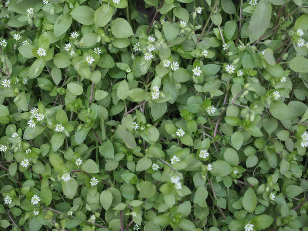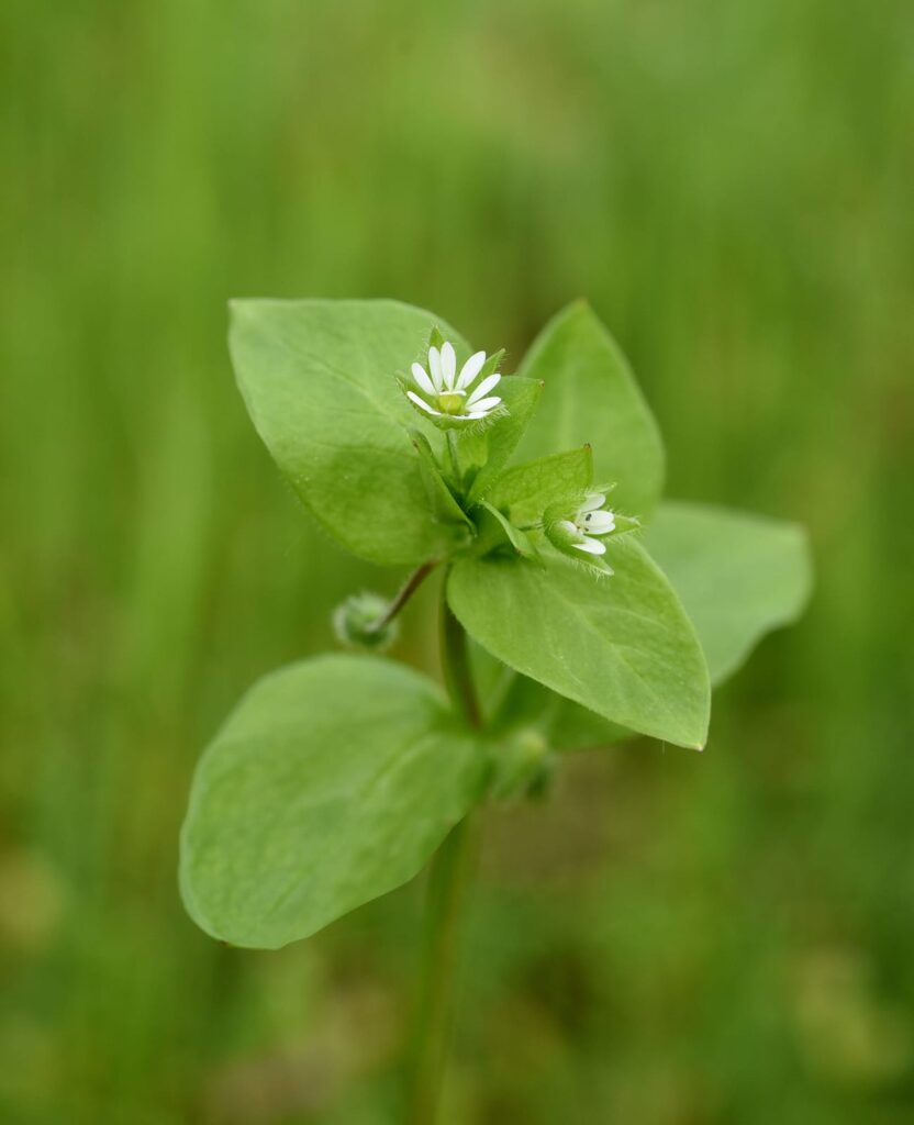 Now for a bit of history. Chickweed (Stellaria media) is a common edible weed found throughout temperate regions worldwide. Historically valued for its mild flavor and wide availability, chickweed has been used as food, fodder, and folk medicine for centuries. It grows low to the ground in mats of small, opposite leaves and tiny white star-shaped flowers, making it easy to harvest in spring and early summer.